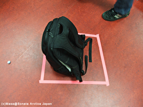 メンバーとクルーの全員が過ごすにはただでさせ狭い楽屋の真ん中に、堂々とこんな風に荷物を置くとみんなの邪魔になるんです!こういうことをしてると、ちょっと席を外したすきにこ〜んな風にテープで囲われてしまいます。誰ですか、こんな自己中な荷物の置き方をするのは!